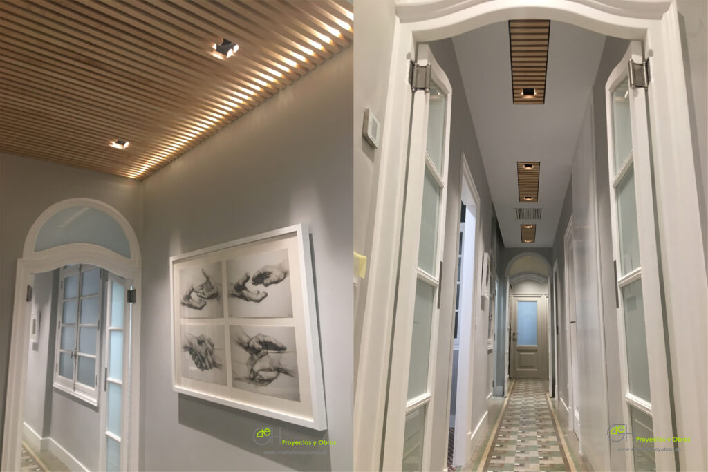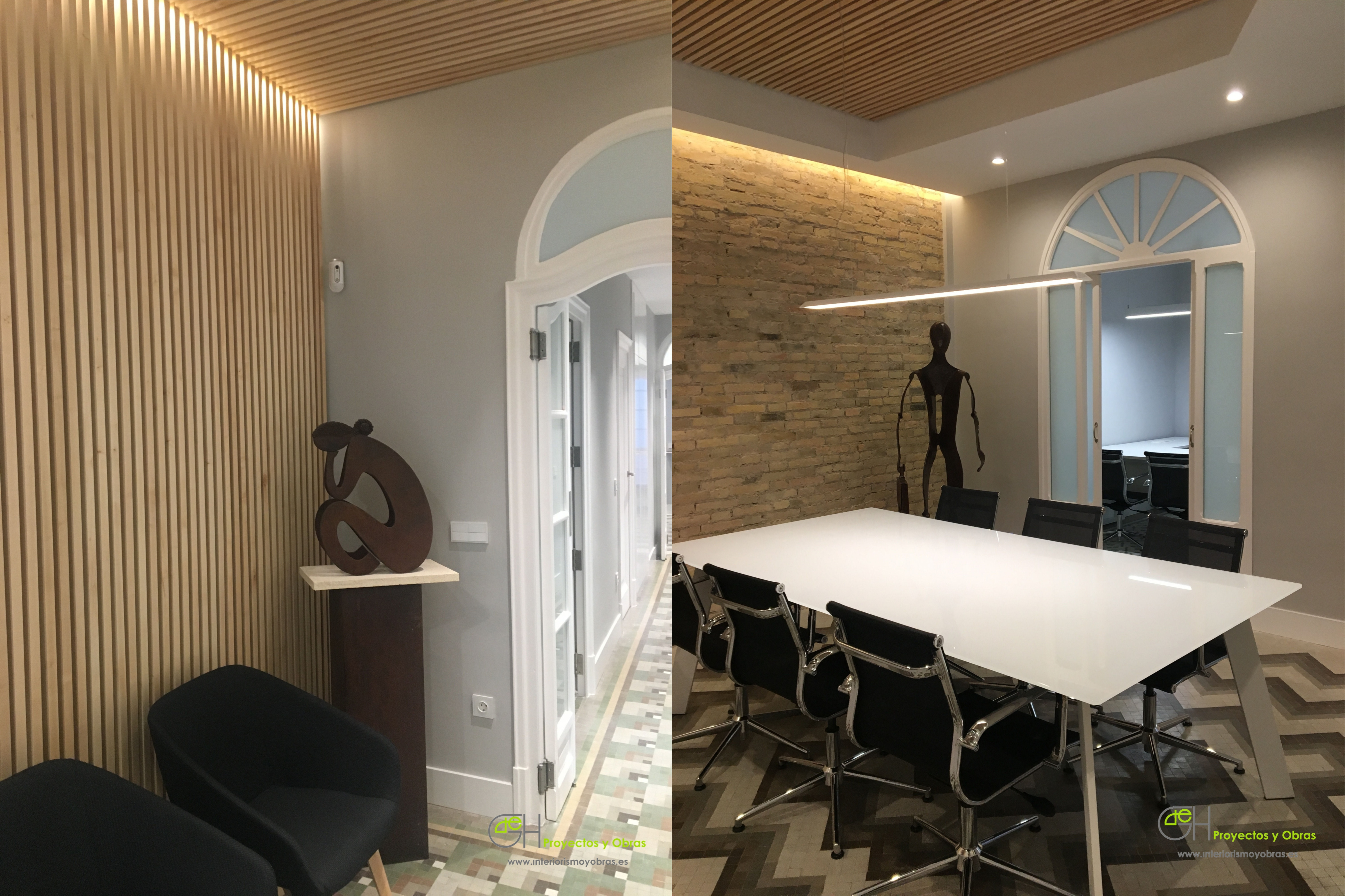 La incorporación principal en la decoración ha sido la madera en forma de listones sobre base negra que nos ha ayudado a dar un carácter especial a las zonas comunes del despacho, entrada, pasillo y sala de juntas.
