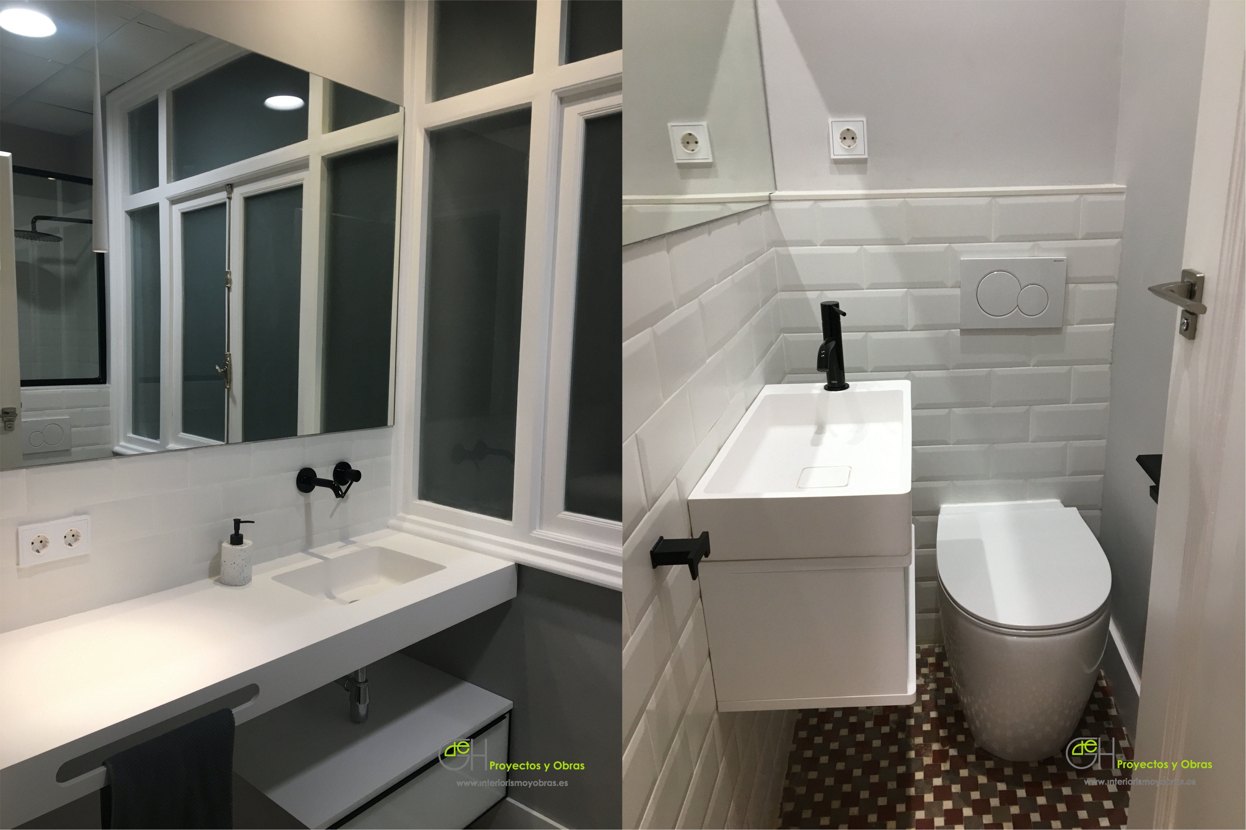 En los baños se ha querido apostar por la sencillez en los revestimientos incorporando el blanco con detalles en negro como son todos los elementos de grifería y la mampara con perfil de hierro negro en la zona de la ducha.